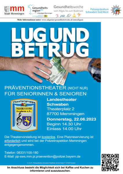 Aufgrund der begrenzten Anzahl der Sitzplätze ist eine Anmeldung bei der PI Memmingen für alle Besucher*innen unter der Telefonnummer 08331/100-180 oder unter der E-Mail-Adresse pp-sws.mm.pi.praevention(at)polizei.bayern.de (Betreff: „Präventionstheater Lug und Betrug“) erforderlich und ab sofort möglich.