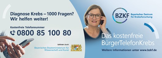 Die Diagnose Krebs ist belastend und wirft viele Fragen auf: Was muss ich jetzt tun? Welche Möglichkeiten habe ich? In dieser schwierigen Situation bietet das BürgerTelefonKrebs des Bayerischen Zentrums für Krebsforschung (BZKF) bayernweit eine kostenfreie telefonische Krebsberatung. Hier finden Patientinnen und Patienten sowie deren Angehörige Rat und Hilfe. Kompetent, vertraulich und anonym.